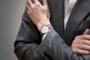 実際に着けさせてもらったが、35mm径に厚さは6.5mmと小振りなため、手首の細い筆者にはバツグンのサイズ感だった。さらに、色合いも上品でスーツスタイルにも程よいアクセントになり合わせやすい。