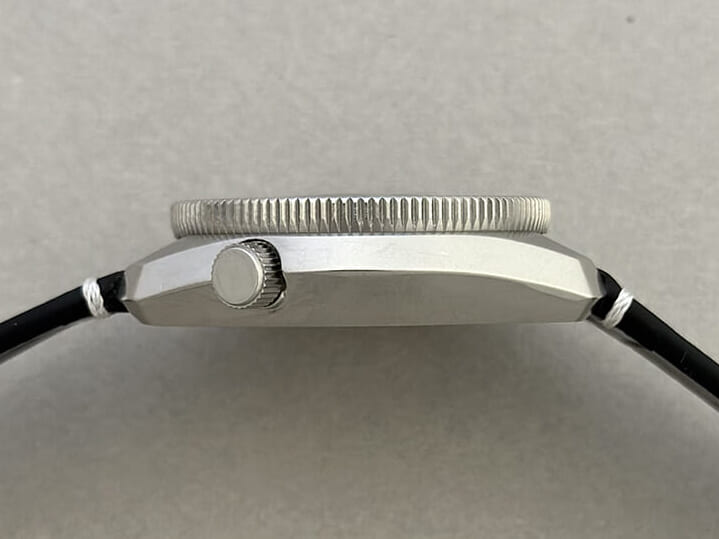 33×44mm、厚さ9mmのスクエアケースがデザインにアクセントを加える。ケースをわずかにカーブさせており装着感は良好だ。