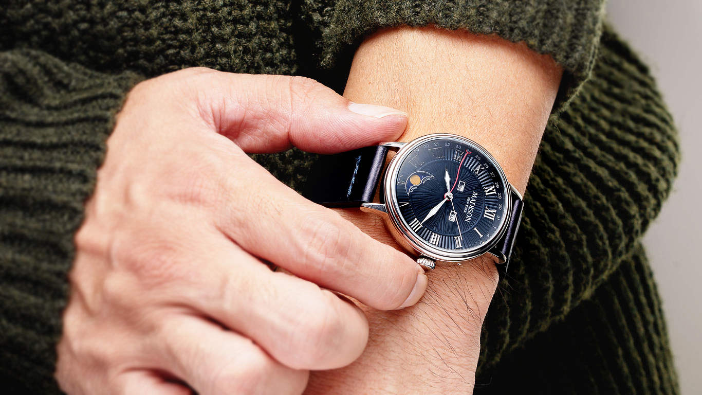 デザインのアイコンとなっているのが6時位置にレイアウトされたムーンフェイズインジケーター。一般的なムーンフェイズとは違い、少し斜めにレイアウトしたことで、遊び心を個性をプラスしている。ムーンフェイズは、リューズを一段引いて時計回りに操作することで調整が可能だ。