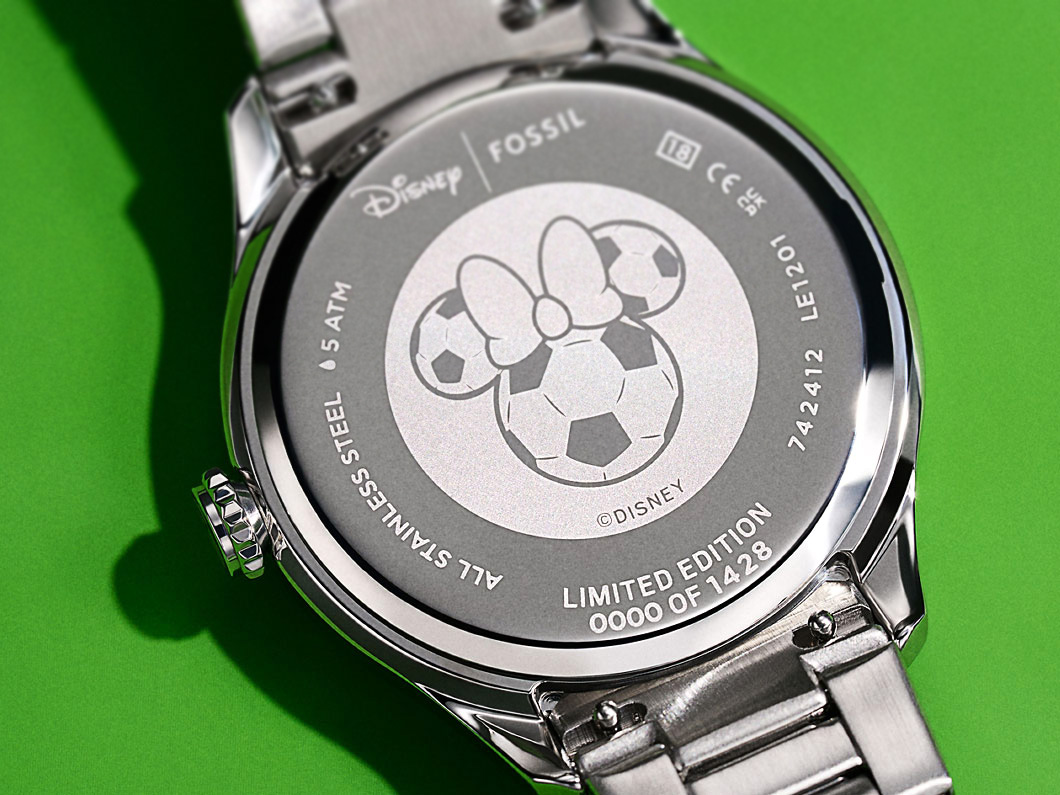 一方の“Disney x Fossil 限定エディション ミニーマウス サッカーウォッチ”は、ミニーマウスがサッカーのMVPとして描かれたモデルで、ポリッシュ仕上げのステンレススチールをベースにした38mmのクラシカルなモデルだ。
