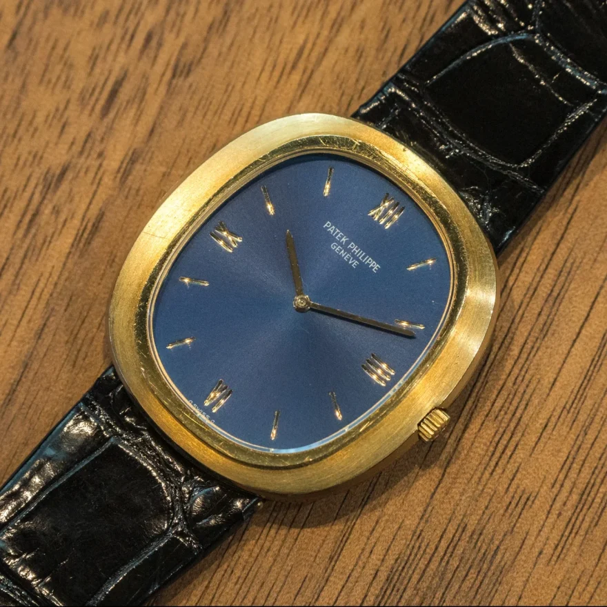 今回紹介するのは、1970年代に製造されたパテック フィリップのゴールデン エリプスだ。18金イエローゴールド製のスリムケースと、オーバル形のフェイスが特徴的で、一見すると同年代の高級薄型手巻き時計を思わせる構成だが、なんと本モデルでは自動巻きのムーヴメントを搭載しているのだ。