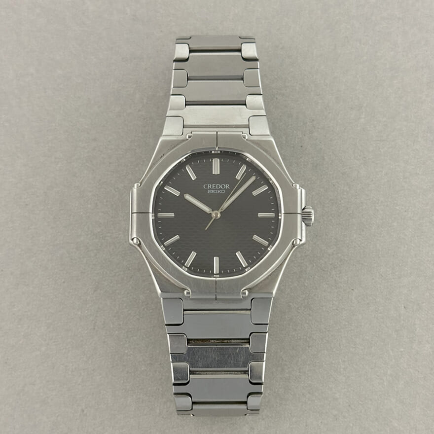 オーデマ ピゲのロイヤルオークを思わせるような8角形のベゼルやケース一体型のブレスレットの造形が特徴的だ。一見するとクレドール ロコモティブにもよく似ているため、ウオッチデザインの巨匠であるジェラルド・ジェンタ氏が手掛けたデザインにも見えるが、本モデルのデザインはジェンタ氏によるものではなく、セイコーの社内デザイナーによるものだった可能性が高いとのことだ。