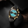 「文字盤に描かれた南極点を中心とした世界地図は、日本の高度経済成長に伴って海外旅行がブームとなりはじめた当時の時代背景を感じさせるもの。オレンジと青を基調としたビビッドな色使いが70年代らしい雰囲気を感じさせます。ヘッドがかなり大きめで装着感があまり良くないのは留意点ですが、オリジナルでは40mだった防水性を20気圧までアップしており、実用性を向上させている点は好印象です」
