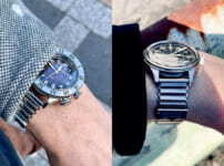 いずれもサテン&ポリッシュ仕上げのチタニウムケースと、反射防止加工を施したサファイアクリスタルを備え、防水性能は5気圧を確保。また、セージグリーンのラバーと布地のファブリックを組み合わせ、ミラネーゼメッシュを思わせる織りの工夫が施されたベルトを装備する。