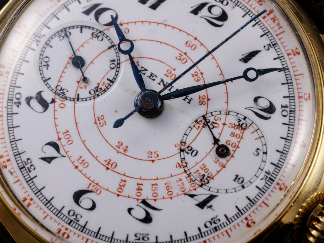 1920年代に初となる腕時計クロノグラフを生み出しているゼニス。この個体も最初期に製造されたモデルのひとつで、開閉式のハンターケース、ポーセリン文字盤など随所に懐中時計を彷彿とさせるディテールを備えている。搭載するのは、後にCal.22へと発展するバルジュー社製のキャリバー“GHT”だ。