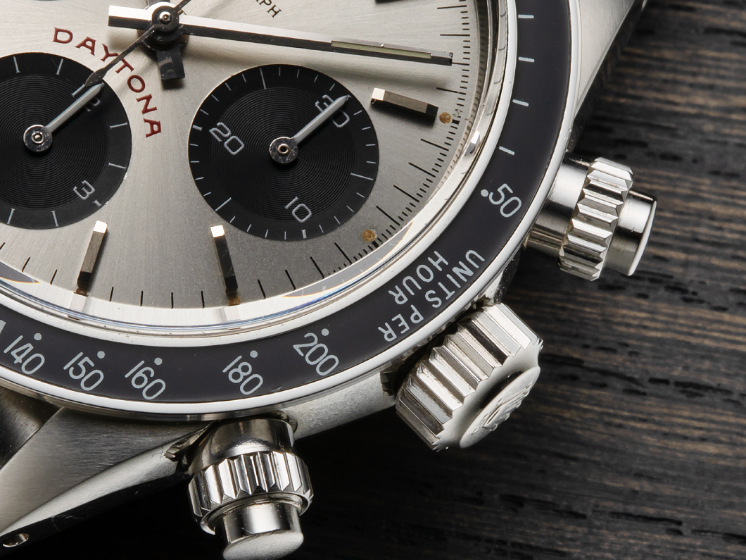 プッシャーがネジ込み式に改められ、気密性が向上したデイトナ第3世代のRef.6263。インデックスの夜光が部分的に欠損しているものの、当時のオリジナル“溝なし”プッシャーに加え、初期型文字盤に見られる“ビッグデイトナ”仕様となっているなど、ツウ好みなディテールを備える1本。