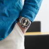 光を受けて鋭く輝くメタリックな腕時計は、スタイルを選ばず着こなしを引き締める一本だ。